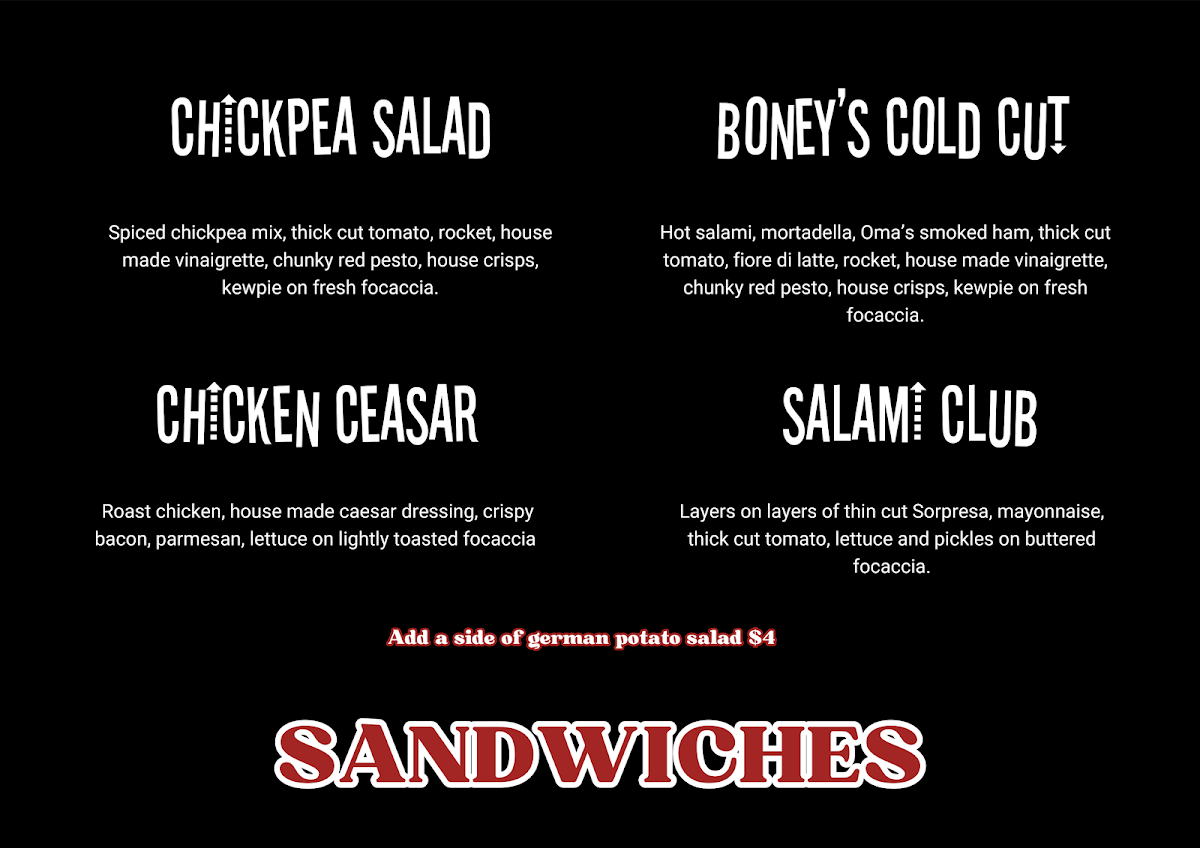 Corned beef, house made pastrami seasoning, Oma’s smoked ham, sauerkraut, Swiss cheese, cabbage slaw topped with Boney’s wasabi ranch lunch sauce on country sourdough.